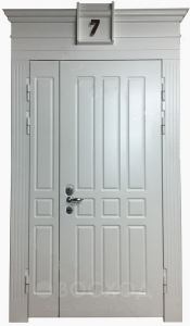 Деревянная панель в отделке всегда придаёт входной группе респектабельность, а в сочетании с прочным металлическим каркасом превращается в надёжный щит для дома. Натуральное дерево устойчиво к случайным ударам, сохраняет форму и привлекательный вид даже при перепадах влажности и температуры, а его фактура подчёркивает статусность фасада. В основе конструкции – сталь толщиной 2 мм и профильная труба, усиленная рёбрами жёсткости, что обеспечивает долговечность и сопротивляемость взлому. Двупольная входная дверь для загородного дома №105 смотрится особенно выигрышно за счёт двух створок: это удобно при приёме гостей, внесении мебели и просто создаёт ощущение простора. Два контура уплотнителей защищают от сквозняков, а при желании дверь можно утеплить минватой или пенопластом. Такое решение совмещает эстетику натурального дерева и мощь металла, делая вход в коттедж не только надёжным, но и по-настоящему представительным.